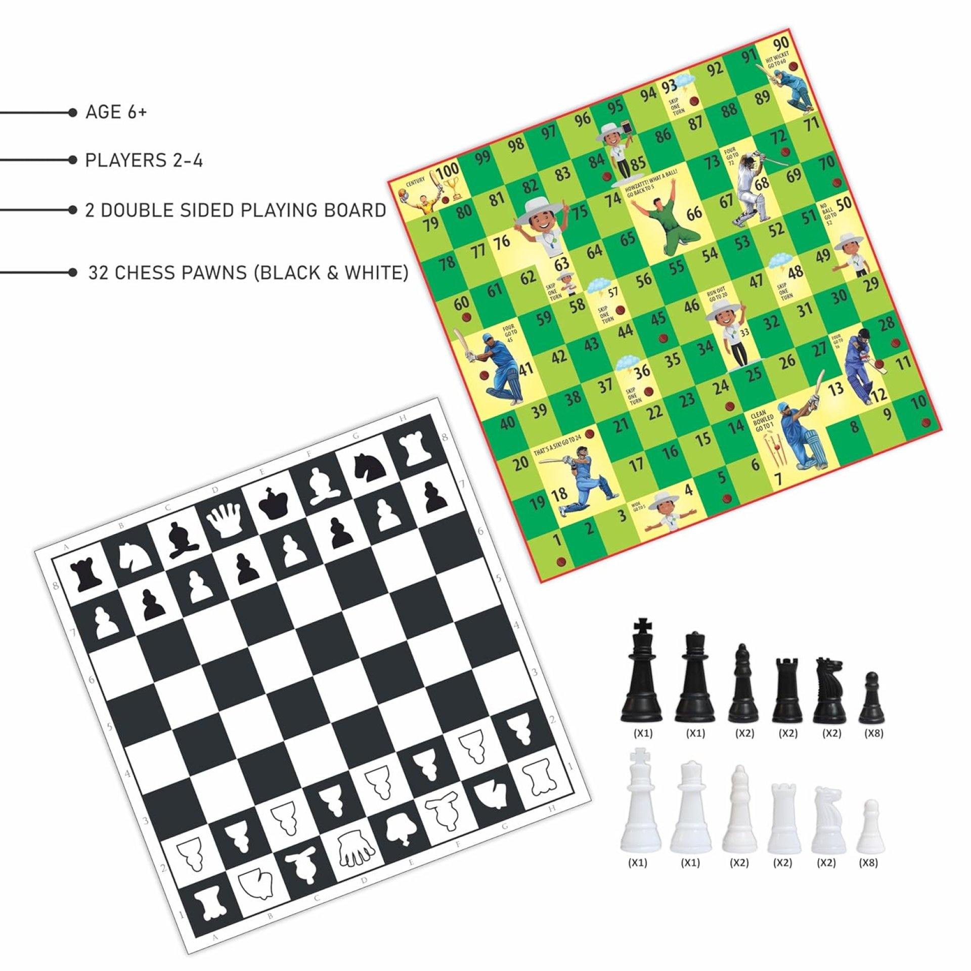 - ???? {THE IDEA} – The 4-in-1 Family Game Set is essential for versatile entertainment, combining Ludo, Snakes & Ladders, Chess, and Cricket into one convenient board. It provides engaging options for all ages, from developing strategic thinking with chess to enjoying casual family fun with Snakes & Ladders and Ludo. The mini cricket game adds a lively, physical activity component.